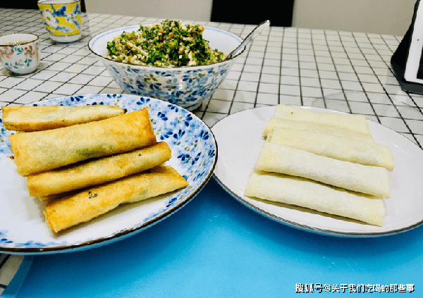 3、取春卷皮,舀一勺荠菜馅,从下往上卷至中间,再把两边向中间对折,再卷起来,边缘沾点水粘住。锅里倒油烧热,放入春卷煎至两面金黄即可。
