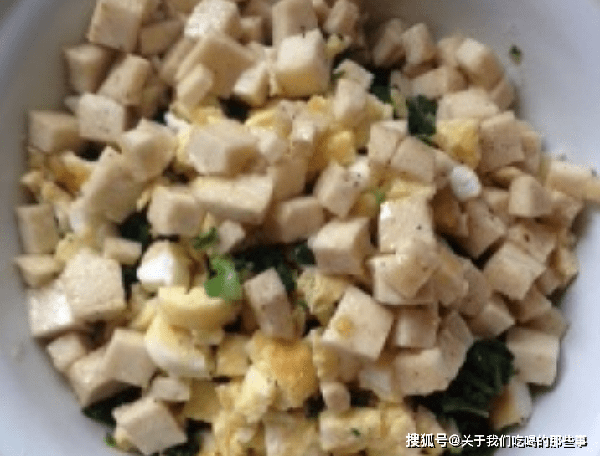 2、起锅烧油,倒入豆腐丁,小火煎至颜色金黄,加适量盐翻炒均匀,盛出放凉。鸡蛋打入碗中,加盐打散,倒入热油锅中摊成鸡蛋饼,煎熟后盛出切成小块。