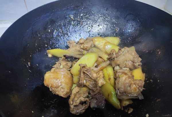 6、待鸡肉炒香后,加入清水,水以没过鸡肉为宜,然后盖上锅盖焖20分钟。相比其他肉类,鸡肉更容易煮熟,所以煮20分钟后,里面的水分就差不多了;