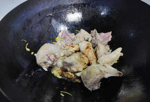 4.姜炒香后加入小葱。锅中小火炒葱,炒香后将鸡肉放入锅中;