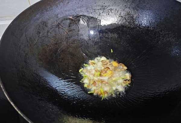 3、锅中水收干后,加入油,将姜放入锅中,边炒边炒一分钟。姜用小火炒,炒的时候要翻过来,以免焦糊;