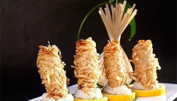 把新鲜基围虾去头去壳,纳碗加柠檬片、姜片、葱节、盐和味精腌味待用。另取净鱼肉剁成茸,再加盐、鸡精、味精和水淀粉一起拌上劲;春卷皮则切成丝。