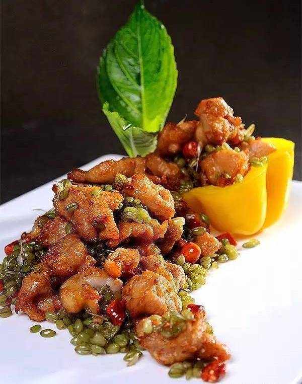 选新鲜的青麦仁入川式卤水锅里,卤10分钟才捞出;另把鸡脆骨纳盆,加盐、鸡精、味精、料酒、姜葱汁、脆炸粉和糯米粉拌匀了腌味。