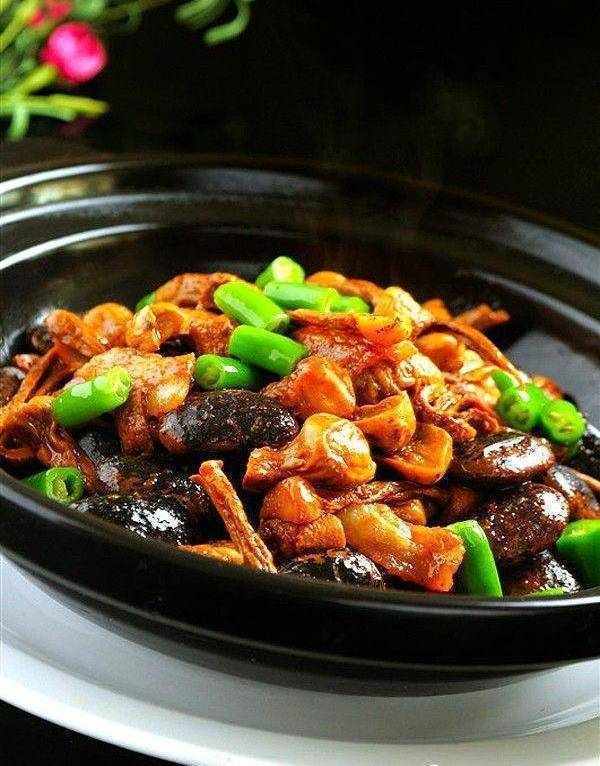锅里放油烧热,先下几片猪五花肉煸香,其间加入蒜瓣、小葱头、煲仔酱,随后倒入岩豆、松茸和青杭椒节,另外加辣鲜露、美极鲜等调味,炒匀以后盛砂煲里便上桌。