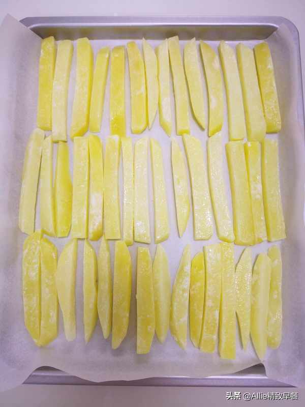 搅拌均匀,让每条都沾上一层薄薄的淀粉,如果时间充裕,切好的马铃薯沥青最好放冰箱冷藏1到3小时。然后过程的口感更酥脆,放冰箱的时候要注意空间,不要让土豆条粘在一起。