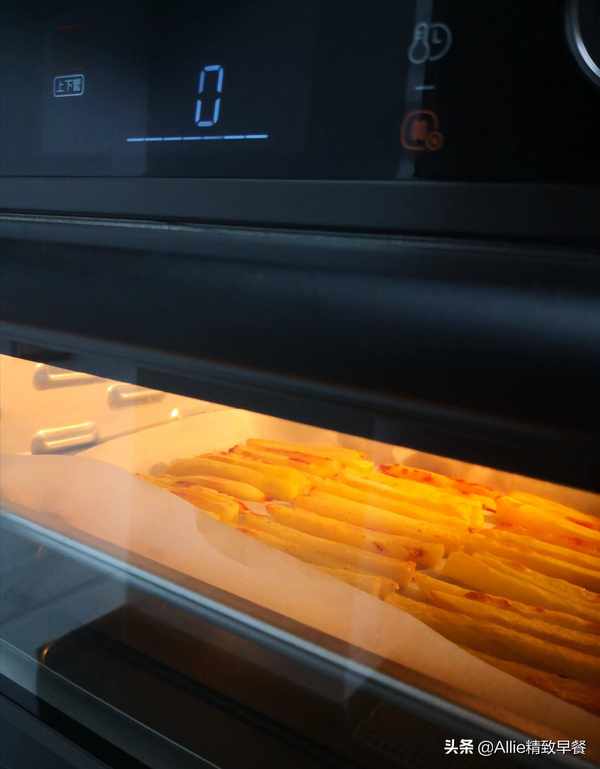 烤箱预热,盘子放在中层,上下管放好,200度烤30分钟。你需要在中间停下来把每条土豆翻过来。