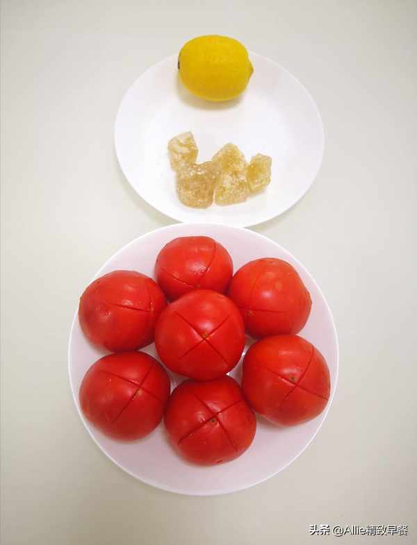 西红柿、柠檬、冰糖、盐。实践】准备7个西红柿(家里一共7个),交叉清洗干净。准备柠檬1个,洗净,加入白糖或白砂糖。糖的量根据个人口味稍微调整。如果它让你高兴。甜食,多加糖。