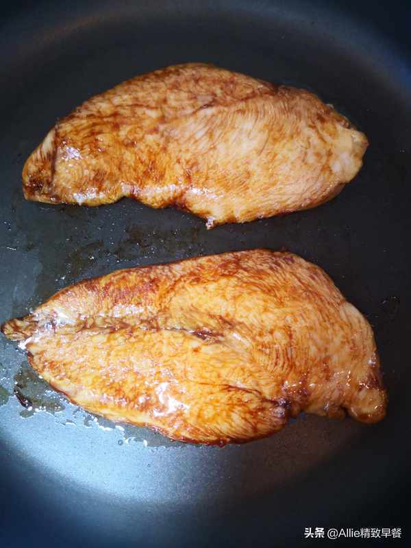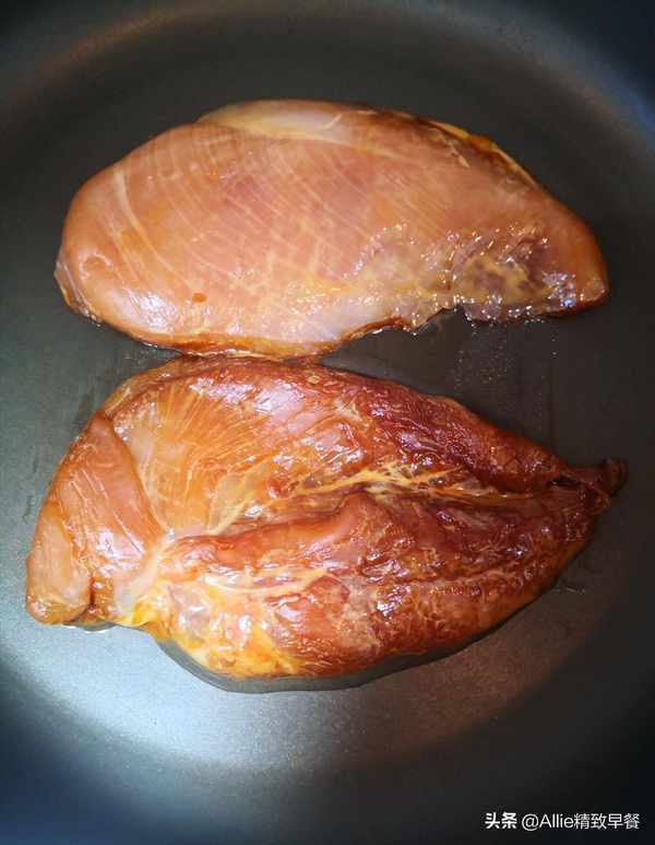 火的大小:平底锅刷一层薄油,将腌制好的鸡胸肉放入锅中,小火慢煎。