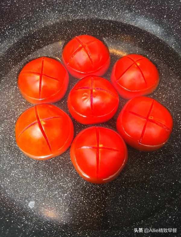 将西红柿放入沸水中,焯两三分钟后,将瓶子切成小块,用刀划十字后放水,以利西红柿去皮。