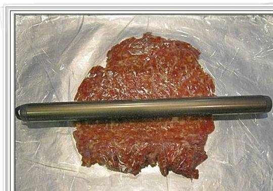 3.取一张烤盘大小的防沾铝箔纸,放入1/3的绞肉,上面盖一张剪开的塑胶袋,用擀面棍擀开。(肉干厚薄自己决定,可分成2-3部份来烤。)