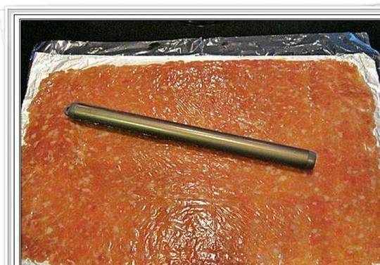 4.将绞肉擀成均匀的大薄片,薄一点口感较好。