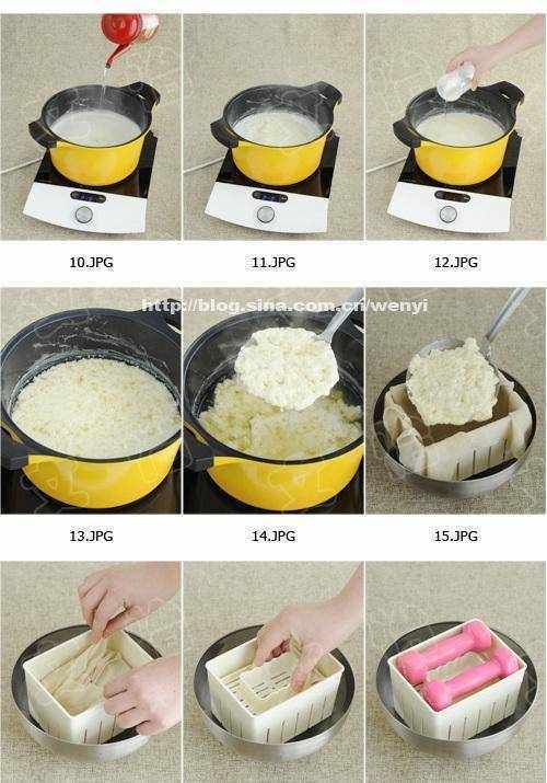 9)将豆腐盒放入有空隙的容器中,浸湿纱布铺在盒内,用漏网滤去豆胶,放入盒内,盖上纱布,盖上盖子。豆腐盒轻轻挤出水分,牛奶不要勉强自己喝,否则会变成干豆腐。