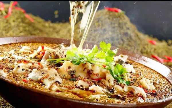 锅中烧水把配料氽水垫底,在加入菜油,猪油,大豆油,,放酸菜,泡萝卜,泡姜,干花椒炒香加入秘制椒麻鱼调料,放入骨头煮5分钟调味捞出,开小火鱼片下锅将鱼片煮熟后捞出倒入盘中,再倒入剩余的汤汁,再起锅烧油干青红花椒淋在鱼上放点香菜点缀。