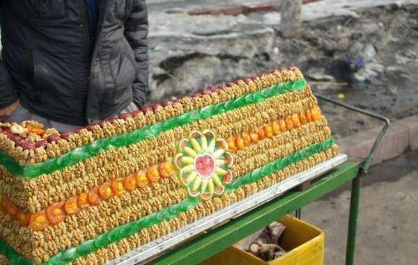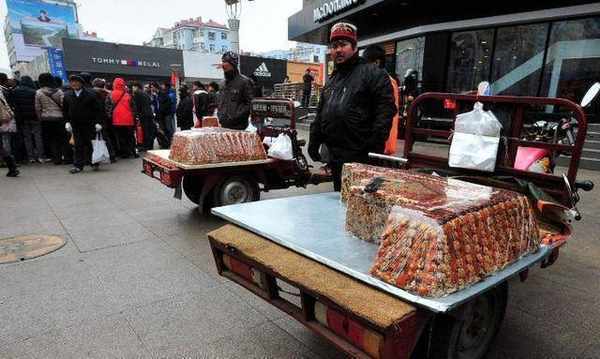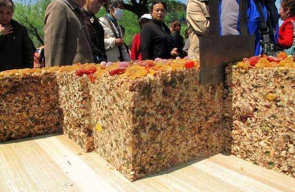 曾经风靡全国的新疆切糕,在国内很多大城市都可以见到,这是新疆维吾尔族的一种特色小吃。主要是采用核桃仁、葡萄干、芝麻、大枣、巴丹杏、玫瑰花等等精品原料,熬制而成的一种特色糕点。