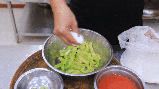 准备一个青茄子,把外皮削干净后,先切成厚片再切成条。切好以后放入盆中,加入一勺食盐,用手抓匀腌制10分钟,杀出茄子中的水分。
