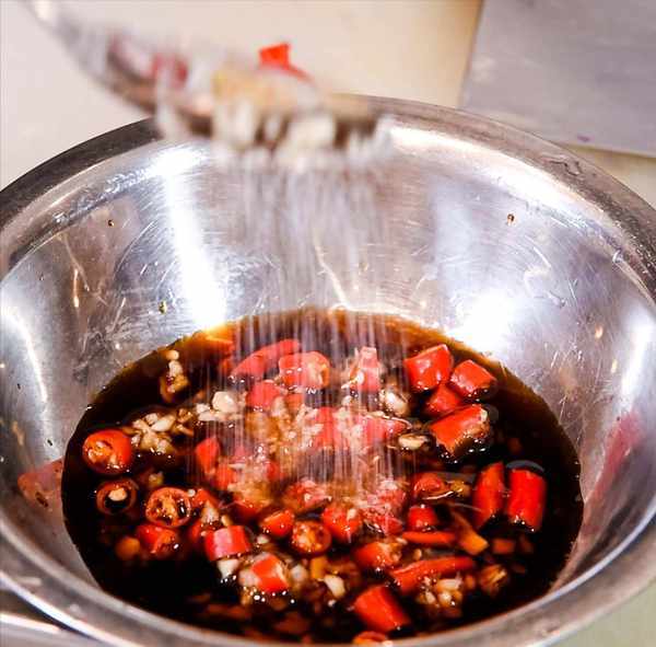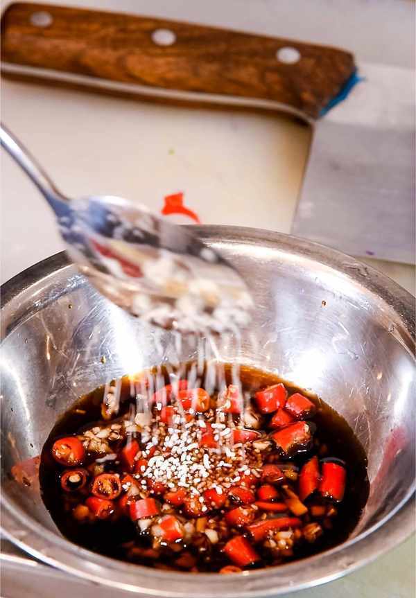 接下来我们来打一碗汁,蒜茸5克,小米椒3克,生抽3克,