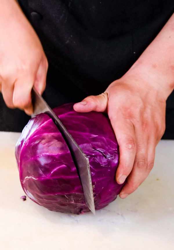 我们把新鲜的紫甘蓝去掉最外层的老皮,然后把紫甘蓝对半切开,再把紫甘蓝的根去掉。制作凉拌紫甘蓝的关键是将紫甘蓝洗净。接下来,将紫甘蓝沿其纹理切成细条。切得越细越好,这样更容易混合和品尝,味道也会改善。