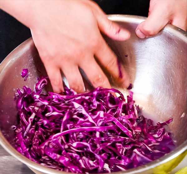 大约10分钟后,用手搓揉紫甘蓝,特别是把紫甘蓝的水分挤出来,这样紫甘蓝吃起来越吃越脆。