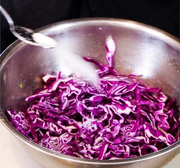 然后将切碎的紫甘蓝放入锅中,撒上盐以杀灭紫甘蓝的水分。