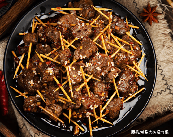 牙签牛肉选用的是小黄牛的肉,口感软嫩不柴。全程采用纯手工的制作方式,将牛肉清洗后加入秘制的卤料。闷煮软烂的牛肉放入红油中煸炒,最后在上面撒上白芝麻增加香味。