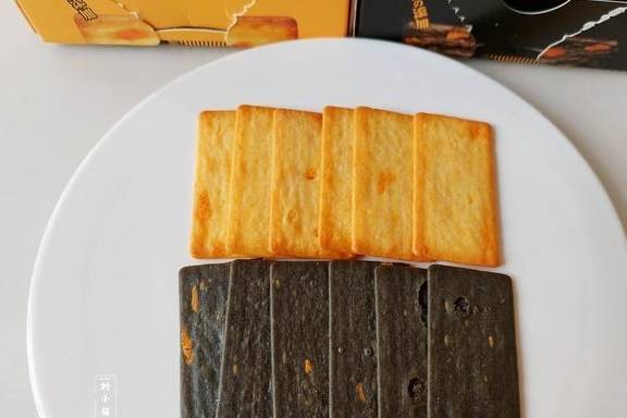 岩烧芝士有两种口味,一种是黄金芝士脆,一种是黑金芝士脆,两种芝士脆都很薄很脆,芝士粉和小麦粉的结合,吃到嘴里满口留香。