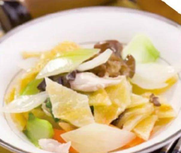 ④锅中油烧热,加入洋葱片略炒,然后加入煮好的鸡胸肉、油菜片、胡萝卜片、香菇片拌匀,加入料酒、鲜汤、馅饼片、白糖、鸡精、味精将剩下的精盐煮沸,淋入香油,盛入汤碗中即可食用。
