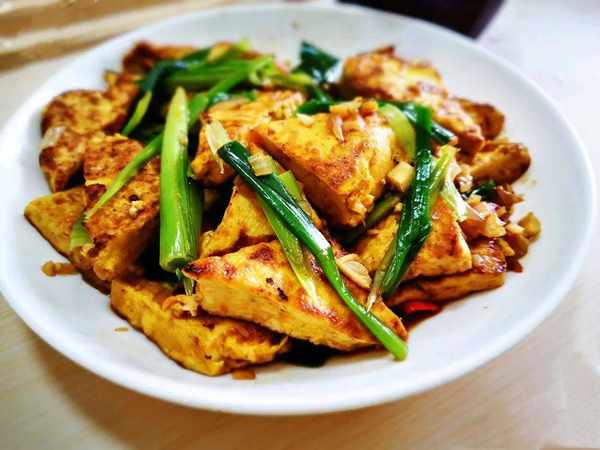 老豆腐适量、蒜苗适量、牛肉肠适量、宴友食用油适量、辣椒酱适量、盐适量