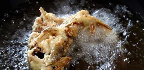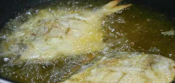 4。然后在锅中加入适量的油,烧热,将鱼放入炸至金黄;
