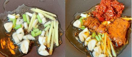 再来热火下油,放入葱姜蒜粒爆香,再加入一勺豆瓣酱,再加入一小块火锅底料,炒出诱人的红油,再倒入两碗清水,煮沸,加入豆芽青菜,和肉片,肉片怕不熟的就闷煮一下,稍微煮一下后整锅倒入大碗中。