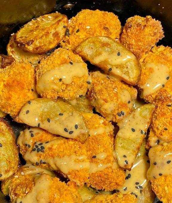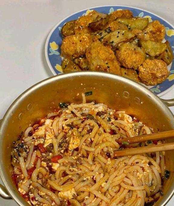 绝了啊!好吃到我想去炸鸡店门口摆个摊!.零失败空气炸锅食谱来了!这个无油炸鸡也太好吃了吧!!我还顺便炸了点薯角..配上无骨炸鸡...姐妹们,真有外卖炸鸡那个味儿了!!.两块鸡胸肉切块。少许姜片+两勺料酒+两勺生抽+一勺蚝油+一勺辣椒面+半勺孜然粉+半勺蜂蜜或者糖+一点黑胡椒和一点点椒盐,腌两三个小时。土豆切块,一勺油+一勺辣椒粉+半勺椒盐+半勺孜然粉+一点点黑胡椒,抓匀。空气炸锅190度,20-25分钟。中间记得翻面两三次!我的空气炸锅容量太小了,而且这次做的比较多,所以我分开烤了,空气炸锅容量大的姐妹们可以把土豆炸鸡放一起烤。.我还做了个豆花米线~都是自带的料,3分钟搞定!米线里面加上豆花真的太好吃了~口感很丰富!尤其是吃到后面,满满都是料!用勺子挖绝了!炸鸡配米线!炸鸡外酥里嫩!米线QQ弹弹!炸鸡上还淋了蜂蜜芥末酱!蜂蜜芥末炸鸡绝了![doge][doge]今天也是吃饱喝足的一天!#我的美食分享#