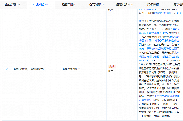 天眼查2月20日消息,上海苏宁易购商业管理发展有限公司近日因有履行能力而拒不履行生效法律文书确定义务,被上海市闵行区人民法院列为失信被执行人(老赖),同时被限制高消费。天眼查显示,该案涉及华润雪花啤酒(中国)有限公司上海销售分公司与该公司相关买卖合同纠纷,生效法律文书确定的义务显示,被告上海苏宁易购商业管理公司向原告华润雪花啤酒上海销售分公司支付货款191.75万余元及利息。