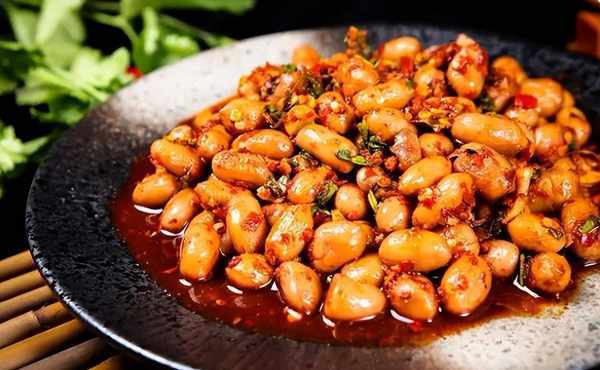 花生米300克,折耳根30克,糖蒜20克,泡菜碎30克,葱花3克。