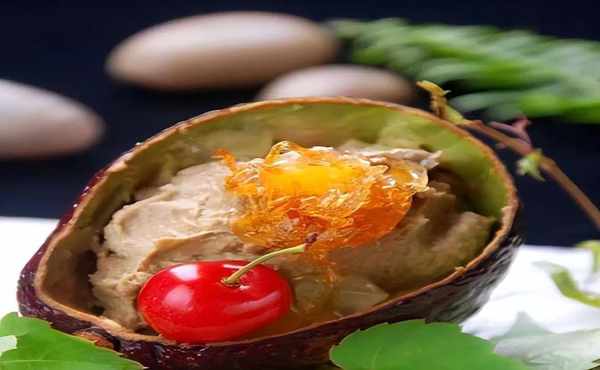 2、把牛油果取果肉,连同花生酱、蛋黄酱和蜂蜜一起放入手持搅拌机,打匀以后再装入牛油果的壳内,最后摆放上血燕,并点缀好樱桃和薄荷叶,即成。
