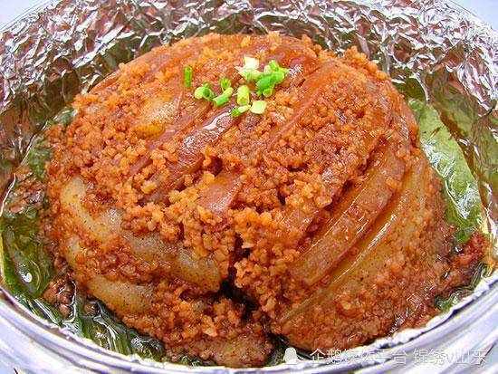 3.将磨好的米粉放入装有五花肉的盆内,加入适量的清水,搅拌均匀,使五花肉均匀的沾满米粉,把肉片放入蒸笼内上锅蒸,上蒸汽后蒸40分钟。关火后焖3分钟,取出后撒点葱花。
