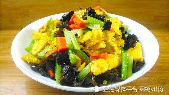 4.另起油锅,放入葱花爆香,然后放芹菜和胡萝卜快速地翻炒至变软,然后再把鸡蛋放进去,木耳也放进去,加入盐、鸡精,翻炒均匀即可出锅。