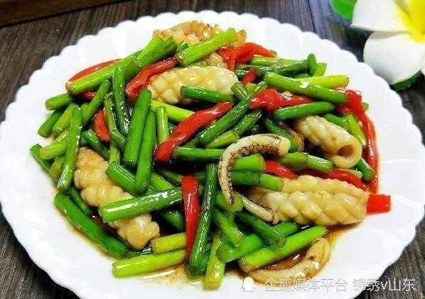 食材:蒜苗400克、鱿鱼200克、辣椒2个、生姜丝少许、生抽一小勺、醋一小勺、盐一小勺、鸡精少许、胡椒粉一小勺