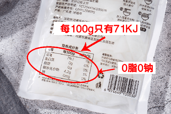每100g只有71kJ,一袋魔芋凉皮230g也才约39大卡!而且还0脂0钠,即使晚上吃也不怕长肉。