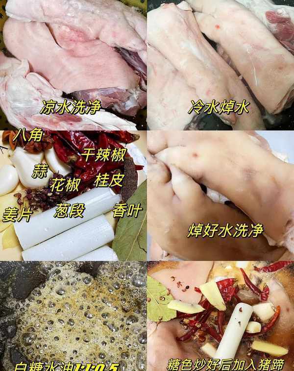 3️⃣锅中加入冷水和糖油,按照1:1:0.5的比例熬糖色。基本上,煮沸五分钟左右,糖色变成焦糖色,有小气泡。焯好的猪脚里面还有香料,开水要没过猪脚。