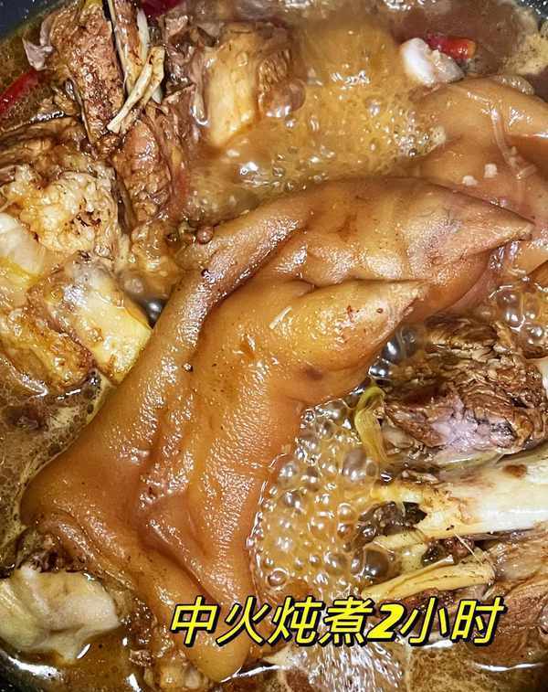 4️⃣猪脚大火煮半小时左右,加入三勺生抽,两勺老抽和两勺蚝油,然后用文火炖一个小时左右,一个小时后加盐,加盐,煮约半小时。筷子可以插进去。如果喜欢吃软耙,可以煮半小时左右,文火炖2小时或2.5小时。