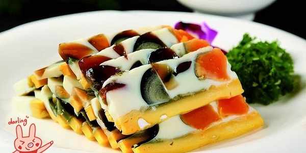 (3)将皮蛋放在豆腐上,淋上酱汁,撒上葱花和熟芝麻。