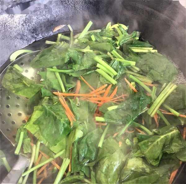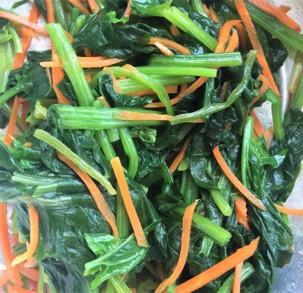 2. 菠菜洗净,切段,胡萝卜切丝。 锅里水开后放入菠菜和胡萝卜丝焯水,捞出过凉水,控干水分备用。