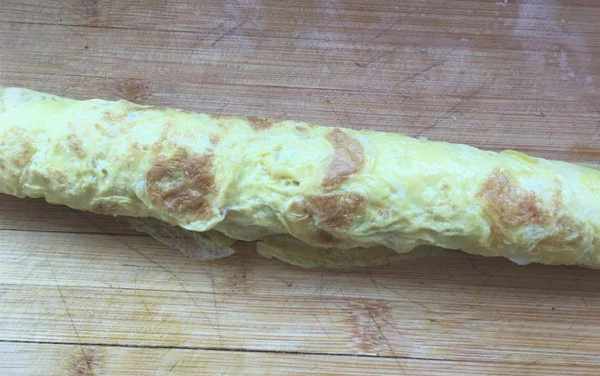 5. 摊好的鸡蛋饼卷起来,切成丝,放入盆中。