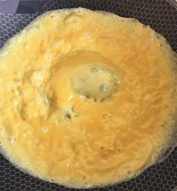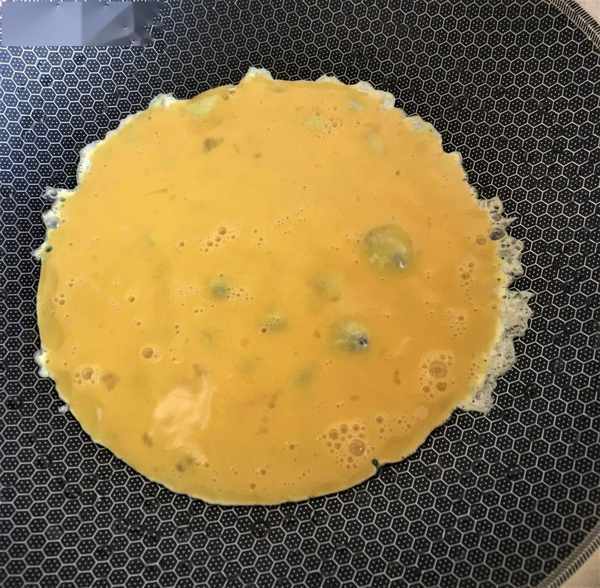 4. 碗中打入两个鸡蛋,搅散。平底锅预热刷油,薄薄的一层即可;倒入蛋液,迅速晃动一下平底锅,将蛋液摊成鸡蛋饼。