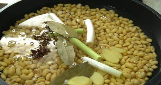 准备一斤提前泡好的黄豆,直接倒入锅中,加足量的水,一小把胡椒粉,少许八角,少许月桂叶,葱,姜片和盐。充分混合并盖上盖子。用大火煮沸,然后用文火慢炖20分钟。