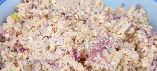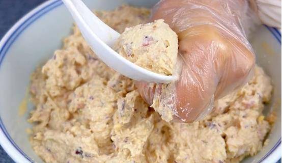 把泡好的豆腐放在一个大碗里,把豆腐捣碎。然后加入肉末、洋葱末、配料和一个鸡蛋,然后将配料混合均匀。加入生抽、蚝油、胡椒粉、盐、糖、面粉半勺、淀粉半勺继续拌匀。