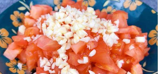 接下来准备一个去皮的西红柿,先切片,再切成条状,最后切成方块。切几瓣大蒜。