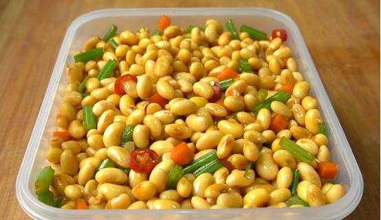 锅里烧开水,加一勺盐拌匀,然后放一把芹菜在水里焯一分钟,时间到了,捞出来过冷水,调水.,取出并切成小方块。然后将切好的胡萝卜放入沸水中焯一分钟,然后捞出水,放入盛有黄豆的碗中。