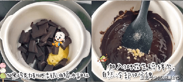 我们再来做脆皮,把黄油跟巧克力切碎,一起隔水融化,然后加入熟花生仁一起翻拌均匀,然后取出冰格,把牙签插入冰淇凌中,均匀的裹上巧克力酱,再放入冰箱中冷冻一小时
