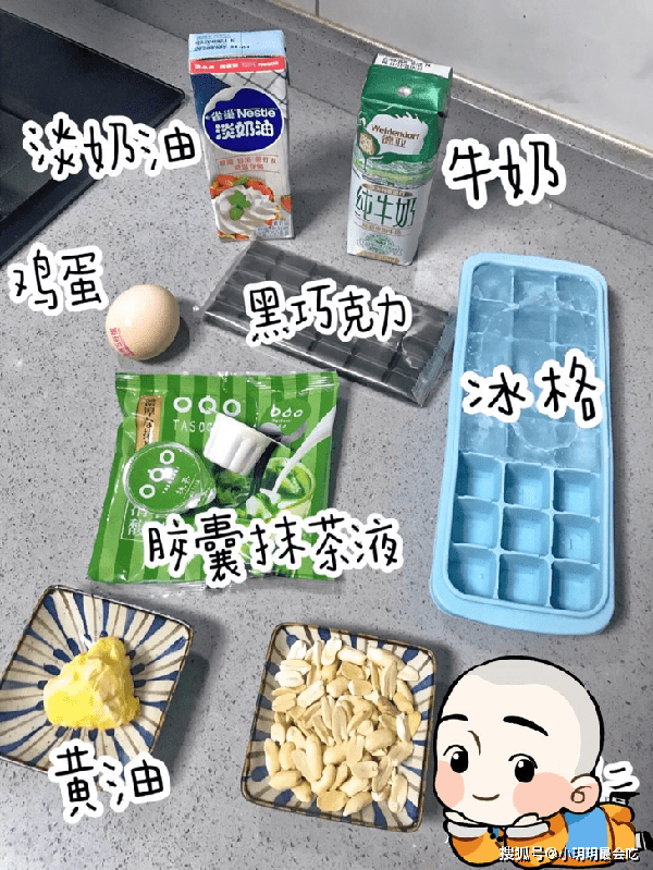 先准备淡奶油250克,牛奶60克,黑巧克力150克,黄油20克,抹茶液70克,熟花生仁30克,鸡蛋1个,冰格一个,然后就可以正式开始咯