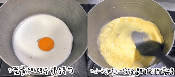 我们先把鸡蛋打入牛奶中,一起放到小奶锅中,小火加热一分钟左右,加热期间要不停的搅拌哟,加热好了就直接过筛一遍,这样的牛奶会更加细腻,接下来就把抹茶液混合进牛奶中,搅拌均匀就好